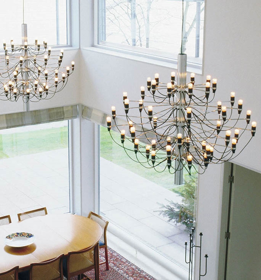 Flos 2097 is verkrijgbaar in verschillende maten en afwerkingen, waardoor het mogelijk is om de variant te vinden die perfect past bij de grootte en stijl van de ruimte. Of hij nu boven de eettafel hangt, in de hal of in een hoge ruimte, hij levert een indrukwekkende visuele uitstraling en een aangenaam, diffuus licht.