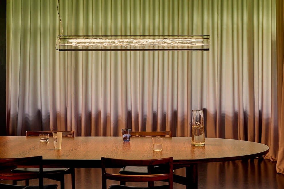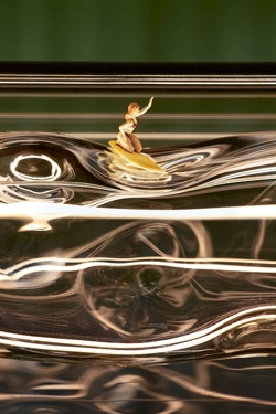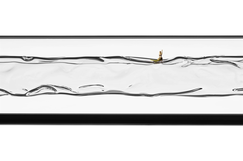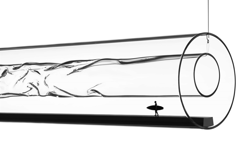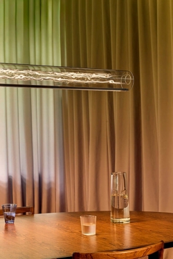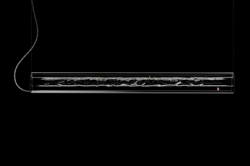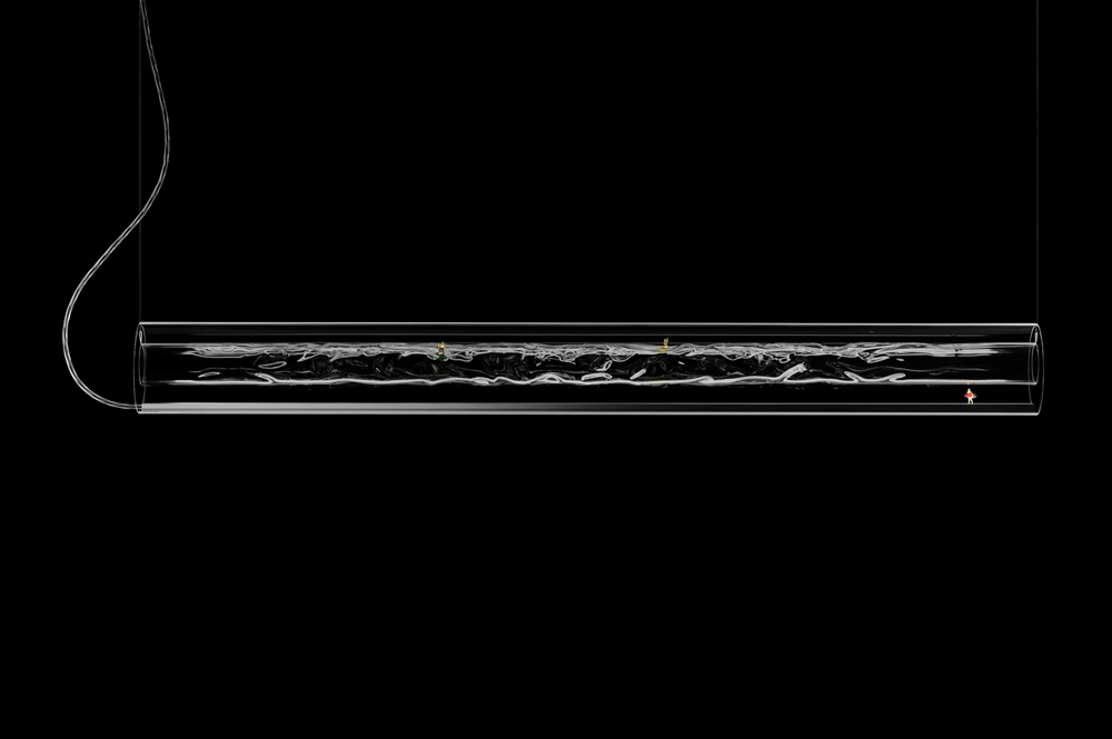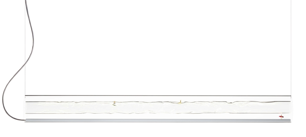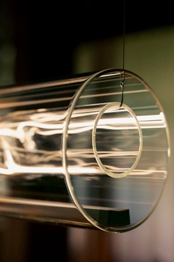 De schermen met 24 karaats bladgoud gegoten met acrylglas worden individueel met de hand vervaardigd in een proces waarbij het echte goud tot een dikte van 1/10.000 mm wordt geslagen, zodat kortgolvig blauw licht tussen de moleculen kan doordringen, terwijl zwak gouden licht wordt gereflecteerd. De vervaardiging van de schermen geeft het bladgoud een prachtig stervormig patroon, dat samen met het contrast tussen het goud en de rode stangen van het frame, het rode snoer en het blauwe lichtpunt een zeer mooie hanglamp creëert.