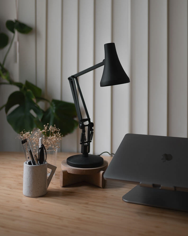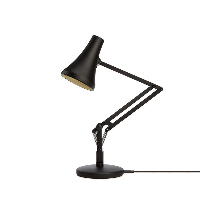 90 Mini Mini tafellamp in koolzwart met een afwerking in geanodiseerd geborsteld aluminium heeft een uiterst functioneel ontwerp, waarbij de lamp 360 graden kan draaien bij de kap en de voet. De unieke tafellamp maakt gebruik van een USB-A kabel, die wordt meegeleverd. Hierdoor kan de lamp eenvoudig worden aangesloten op bijvoorbeeld de USB-A poort van je computer voor verlichting tijdens het thuiswerken of om een recept in de keuken van dichtbij te bekijken.