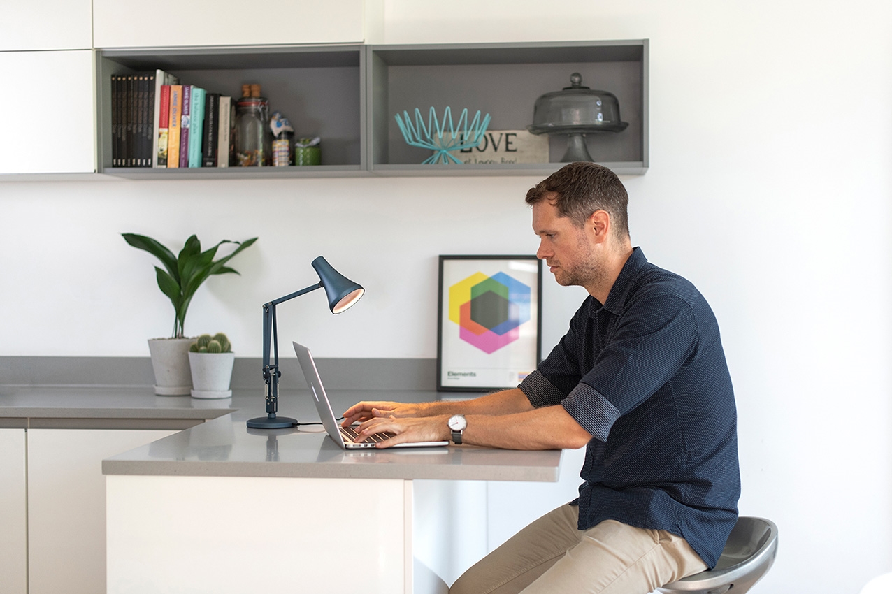 90 Mini Mini tafellamp in staalblauw met een afwerking in geanodiseerd geborsteld aluminium heeft een uiterst functioneel ontwerp, waarbij de lamp 360 graden kan draaien bij de kap en de voet. De unieke tafellamp gebruikt een USB-A kabel, die wordt meegeleverd. Hierdoor kan de lamp eenvoudig worden aangesloten op bijvoorbeeld de USB-A poort van uw computer voor verlichting tijdens het thuiswerken of om een recept in de keuken van dichtbij te bestuderen.