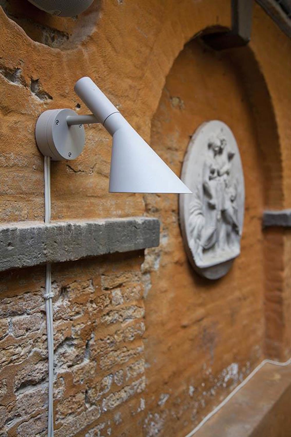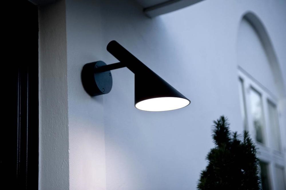 De AJ lamp heeft een karakteristieke zuivere vorm met een combinatie van rechte en gebogen hoeken, die ook tot uiting komt in deze buiten wandlamp.