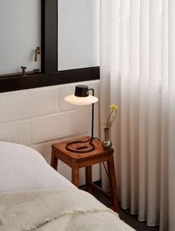 Het oppervlak van de lamp is gemaakt van zwart natgelakt frame, terwijl de ring en de vingerschroef van onbehandeld messing zijn. De lamp heeft veel kleine details die je langzaam ontdekt naarmate je meer naar de lamp kijkt. De lamp heeft bijvoorbeeld een messing schroef die de kap op zijn plaats houdt. Het onbehandelde messing kan in de loop der tijd patineren. Dit is een deel van het ontwerp van de lamp.