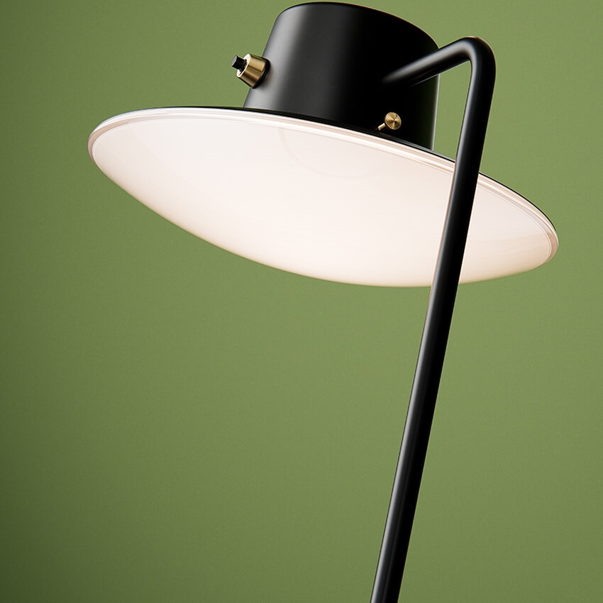 Het oppervlak van de lamp is gemaakt van zwart natgelakt frame, terwijl de ring en de vingerschroef van onbehandeld messing zijn. De lamp heeft veel kleine details die je langzaam ontdekt naarmate je meer naar de lamp kijkt. De lamp heeft bijvoorbeeld een messing schroef die de kap op zijn plaats houdt. Het onbehandelde messing kan in de loop der tijd patineren. Dit is een deel van het ontwerp van de lamp.