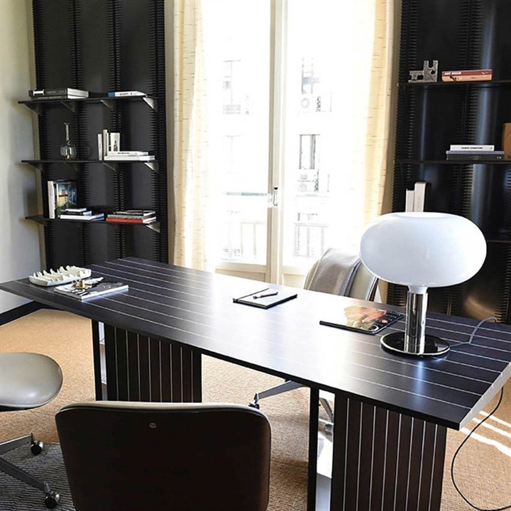 De AM1N tafellamp heeft een minimalistisch ontwerp met een verchroomde basis en een kap van wit opaalglas.