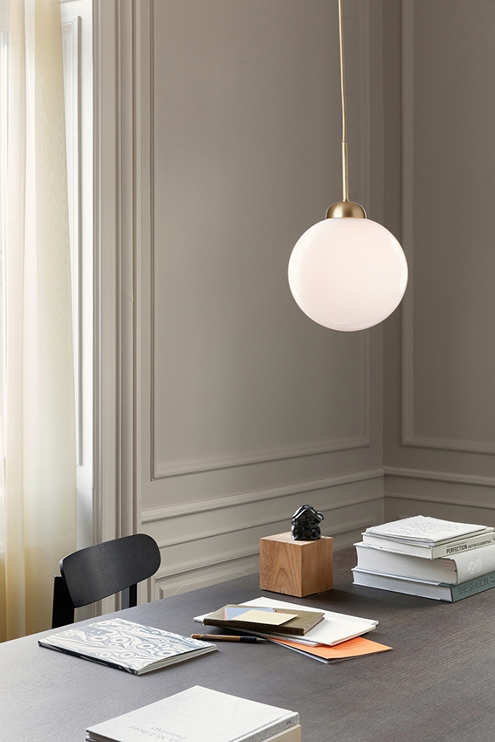 De Apiales 1 large hanglamp bestaat uit één mondgeblazen opaal glazen koepel en satijn zwarte details. De elegante hanglamp geeft een klassieke uitstraling aan de ruimte zonder andere elementen te verstoren.