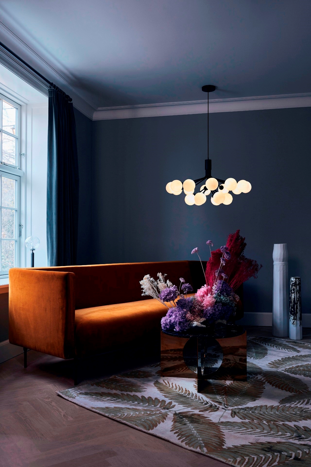 Apiales 18 bestaat uit negen mondgeblazen glazen bollen en is verkrijgbaar in gouden Brushed Brass Finish of Satijn Zwart. Vanuit een speciaal vervaardigde kap ontvouwen de fijne buizen zich als bloemstelen met het mondgeblazen glas.