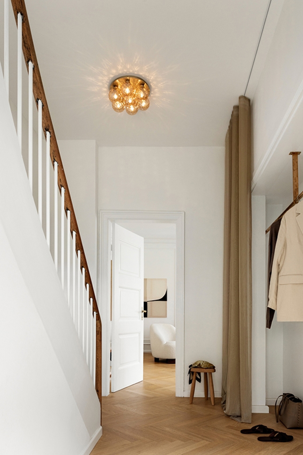 Apiales 7 plafondlamp wordt direct aan het plafond gemonteerd en heeft een lage hoogte van 16,5 cm. Dit maakt de lamp zeer veelzijdig - en maakt het nu mogelijk om een plafondlamp/kroonluchter te hebben, waar het plafond laag is of in doorgangsruimtes.