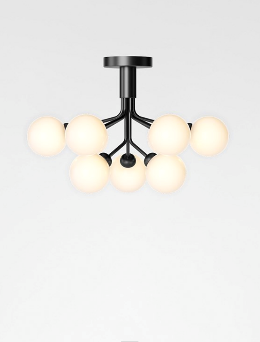 Apiales 9 plafondlamp wordt direct aan het plafond gemonteerd en heeft een lage hoogte van 40 cm. Dit maakt de lamp zeer veelzijdig - en maakt het nu mogelijk om een plafondlamp/kroonluchter te hebben, waar het plafond laag is of in doorgangsruimtes.