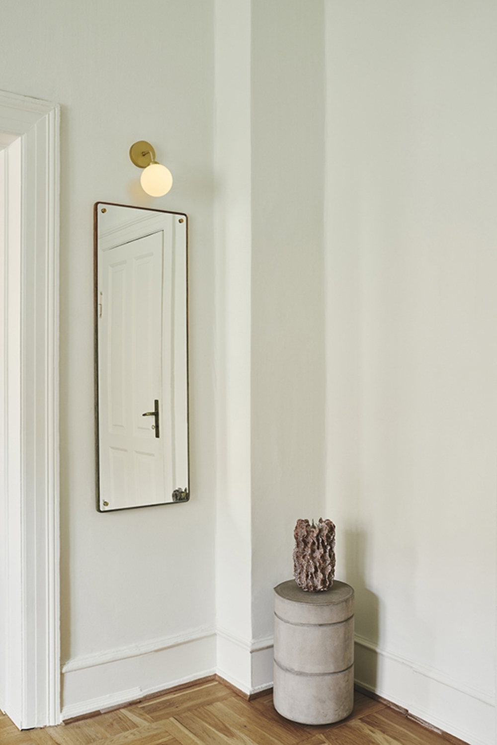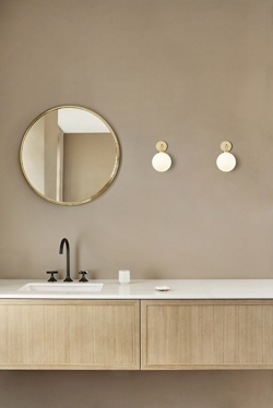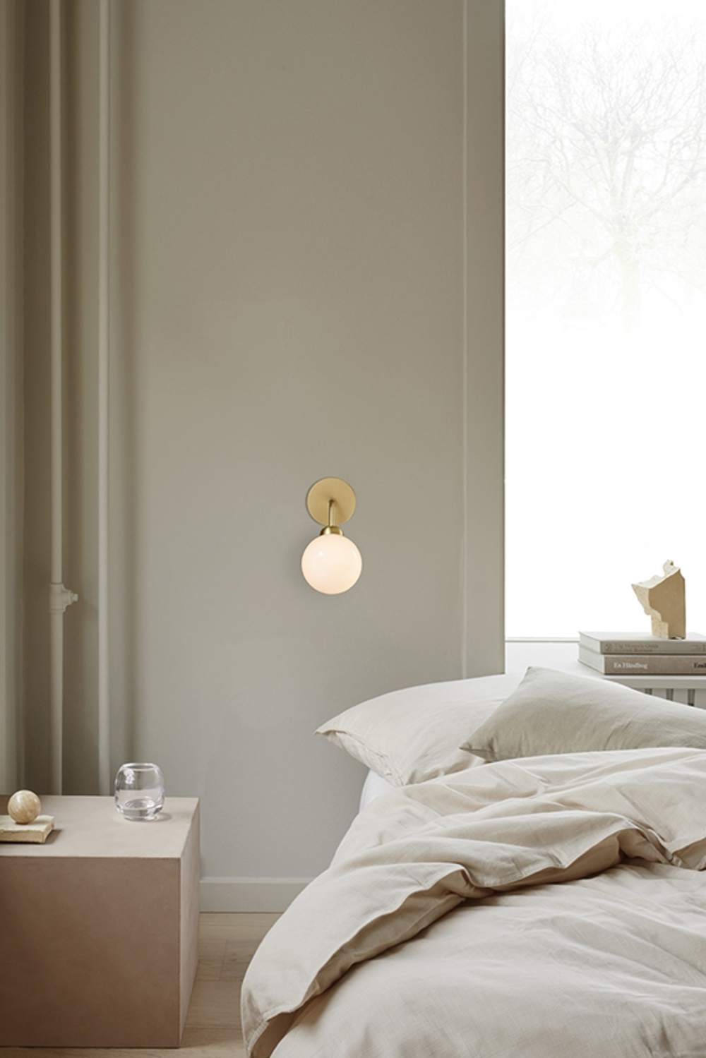 De Apiales wandlamp bestaat uit één mondgeblazen opaalglazen koepel en geborstelde messing details. De elegante wandlamp geeft een klassieke uitstraling aan de ruimte zonder andere elementen te verstoren.