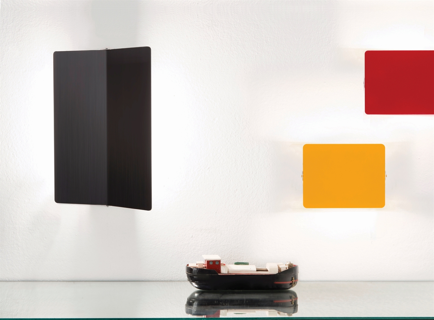 Applique À Volet Pivotant wandlamp heeft een frame gemaakt van aluminium, dat wit is geschilderd, en een klep aan de voorkant, die verkrijgbaar is in de kleuren; rood, geel, blauw, zwart, aluminium en roestvrij staal.