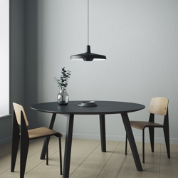 Arigato lampen bestaan uit een lichaam van stalen buizen en een aluminium kap. Het oppervlak is een mat zwarte of witte poedercoating.