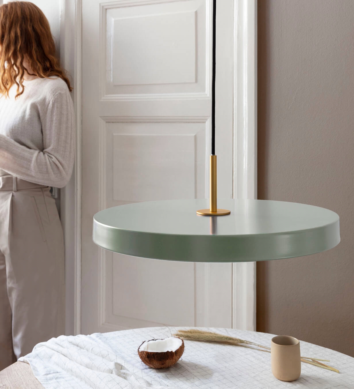 Umage Asteria medium hanglamp, tint olive met top in messing - ontworpen door Søren Ravn Christensen