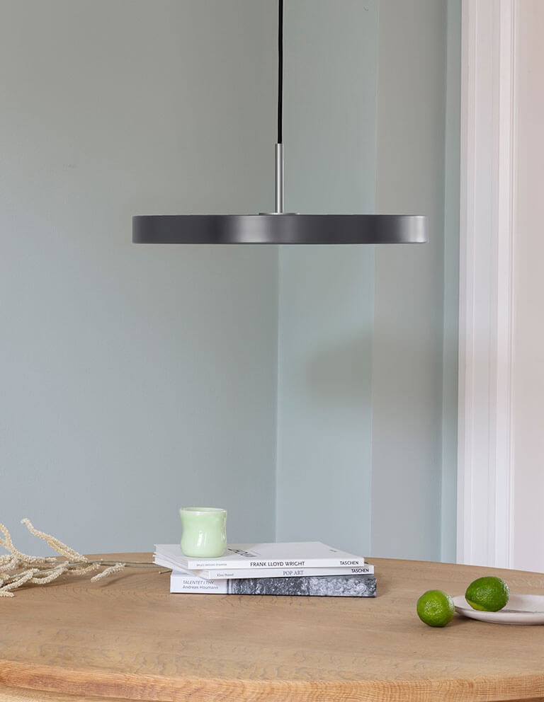 Asteria medium hanglamp verspreidt een zacht licht vanuit de geïntegreerde LED-lichtbron. De populaire lamp heeft een minimalistisch ontwerp met een eenvoudig en tijdloos karakter. De slanke en elegante vorm van de hanglamp maakt het een uitstekende keuze voor keukenruimtes, als lamp boven de eettafel of als verlichting in de slaapkamer, hal of woonkamer.