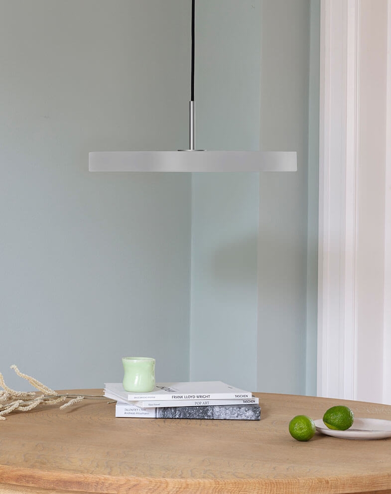 Asteria medium hanglamp in mist grijs verspreidt een zacht licht vanuit de geïntegreerde LED-lichtbron. De populaire lamp heeft een minimalistisch ontwerp met een eenvoudig en tijdloos karakter. De slanke en elegante vorm van de hanglamp maakt het een voor de hand liggende keuze voor keukenruimtes, als lamp boven de eettafel of als verlichting in de slaapkamer, hal of woonkamer.