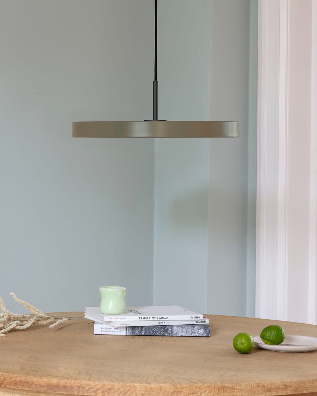 Asteria hanglamp is verkrijgbaar in de maten micro, mini of medium in verschillende kleuren met een top in messing en voor mini en medium ook met een top in staal of zwart. Er is bovendien een Plus-variant van de hanglamp in de maten mini en medium met ingebouwde dimmer en mogelijkheid voor montage in een lichtrail.