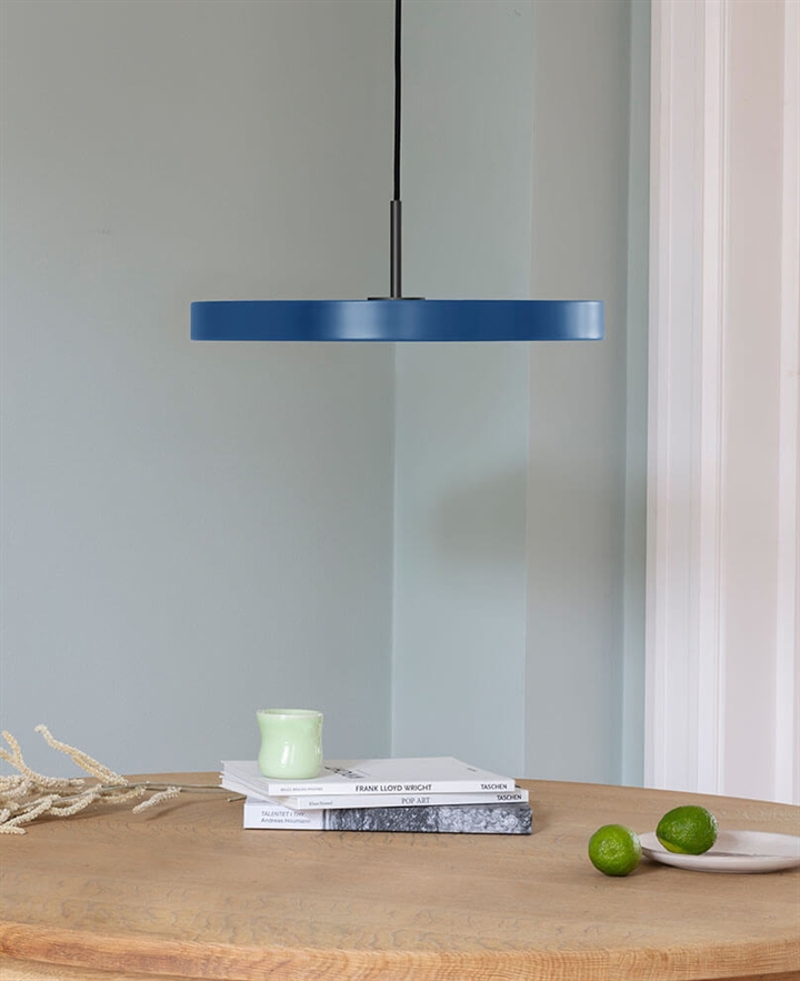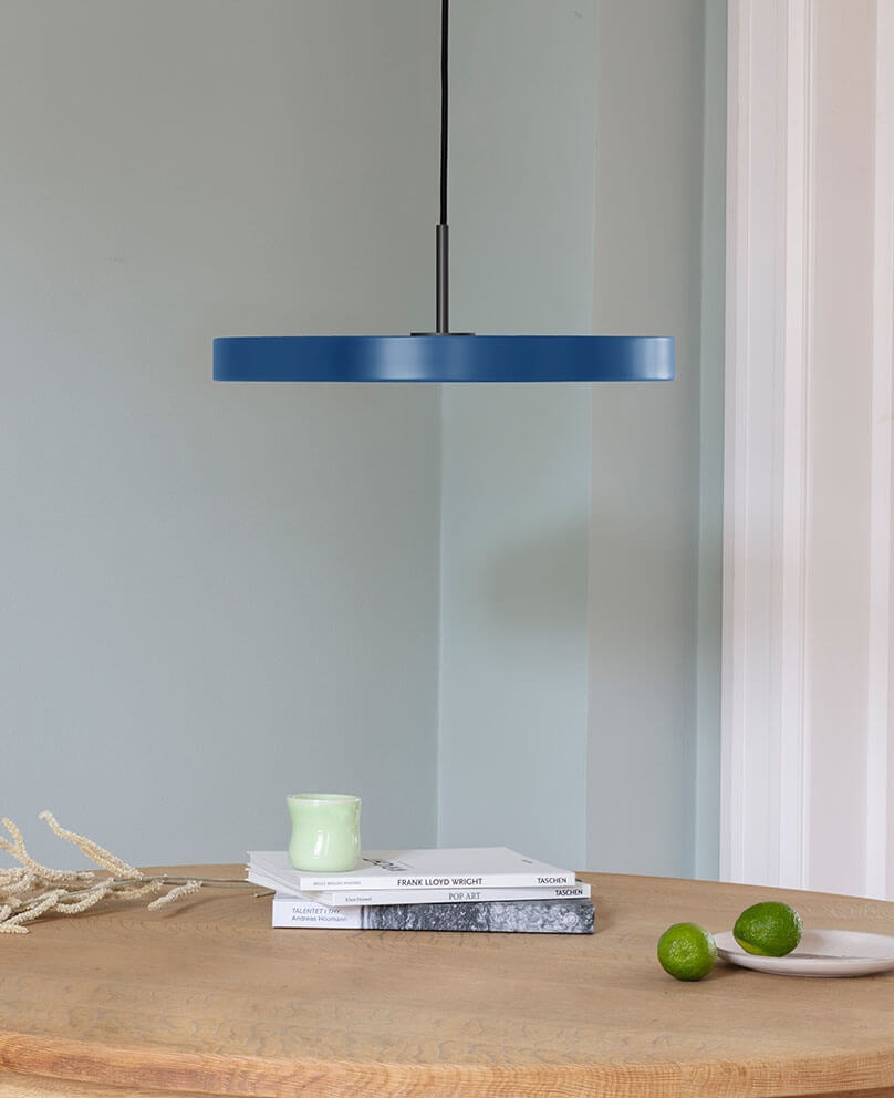 Asteria medium hanglamp in petrolblauw straalt een zacht licht uit van de geïntegreerde LED-lichtbron. De populaire lamp heeft een minimalistisch ontwerp met een eenvoudig en tijdloos karakter. De slanke en elegante vorm van de hanglamp maakt het een voor de hand liggende keuze voor keukenruimtes, als lamp boven de eettafel of als verlichting in de slaapkamer, hal of woonkamer.