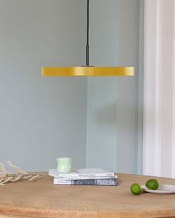 Asteria hanglamp is verkrijgbaar in de maten micro, mini of medium in verschillende kleuren met een top in messing en voor mini en medium ook met een top in staal of zwart. Er is bovendien een Plus-variant van de hanglamp in de maten mini en medium met ingebouwde dimmer en mogelijkheid voor montage in een lichtrail.