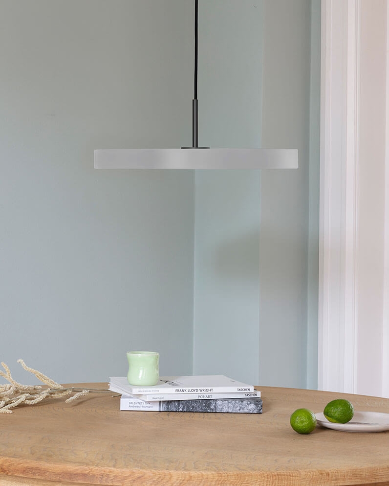 Asteria medium hanglamp in mist grijs verspreidt een zacht licht vanuit de geïntegreerde LED-lichtbron. De populaire lamp heeft een minimalistisch ontwerp met een eenvoudig en tijdloos karakter. De slanke en elegante vorm van de hanglamp maakt het een voor de hand liggende keuze voor keukenruimtes, als lamp boven de eettafel of als verlichting in de slaapkamer, hal of woonkamer.