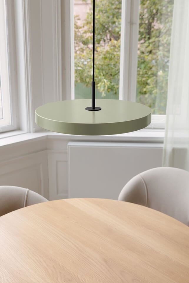 Asteria medium hanglamp in olijfgroen verspreidt een zacht licht vanuit de geïntegreerde LED-lichtbron. De populaire lamp heeft een minimalistisch ontwerp met een eenvoudig en tijdloos karakter. De slanke en elegante vorm van de hanglamp maakt het een voor de hand liggende keuze voor keukenruimtes, als lamp boven de eettafel of als verlichting in de slaapkamer, hal of woonkamer.