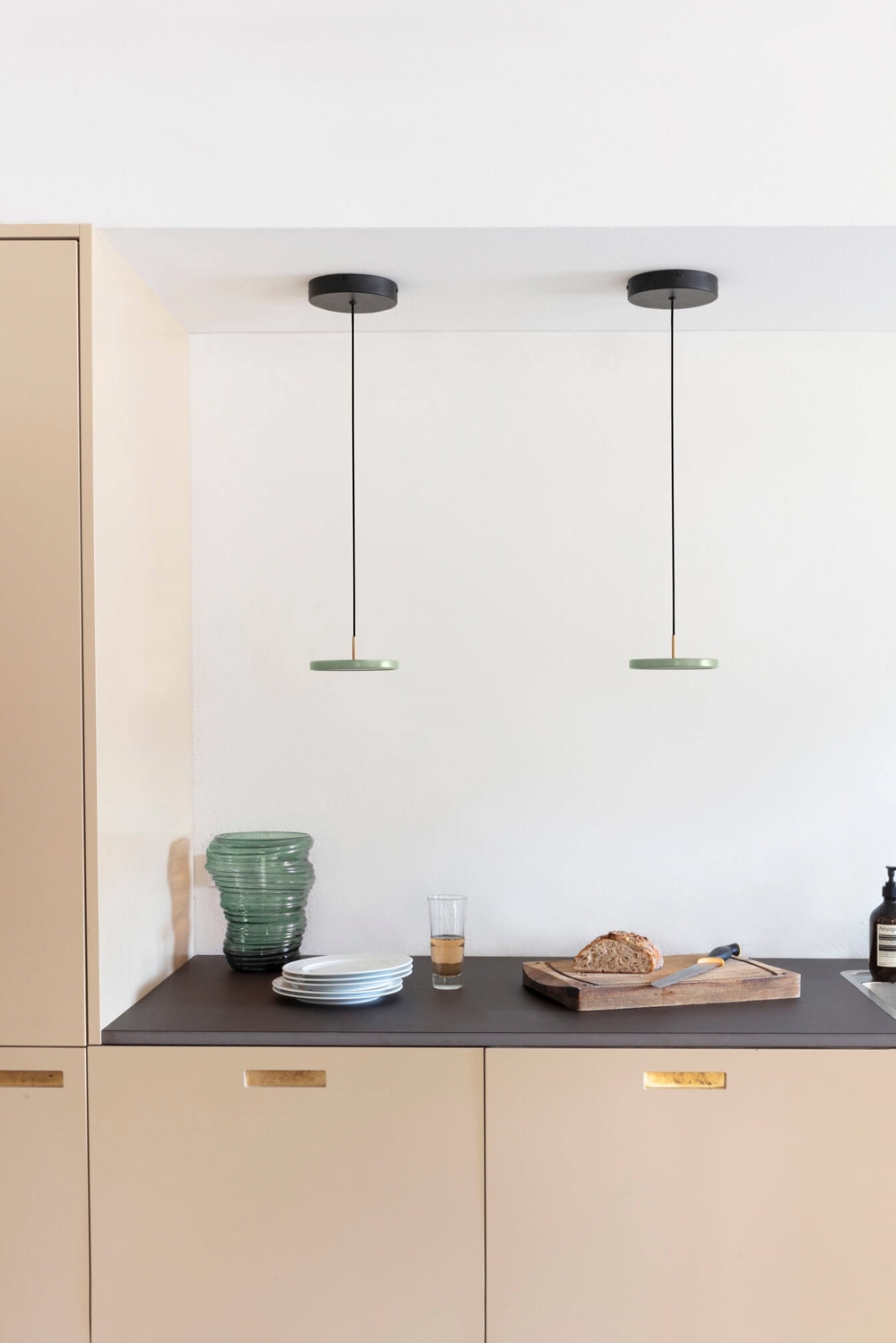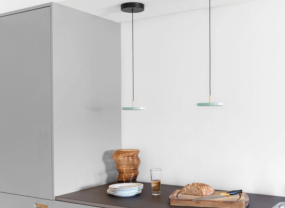 Asteria micro hanglamp in olijfgroen straalt een zacht licht uit van de geïntegreerde LED-lichtbron. Deze kleine variant van de populaire Asteria hanglamp heeft een minimalistisch design met een eenvoudig en tijdloos uiterlijk. De slanke vorm en kleine grootte van de hanglamp maken het een ideale keuze als keukenhanglamp, die alleen of in een rij boven het aanrecht kan hangen voor praktisch werklicht.