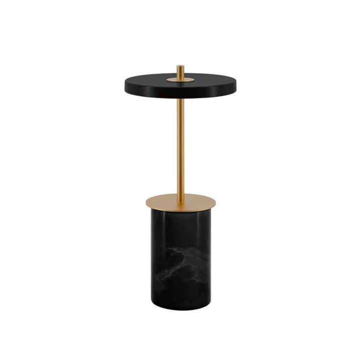 De batterijlamp Asteria Move mini met zwarte kap en messing steel is een draagbare tafellamp met een basis van zwart marmer. Hij is gemakkelijk mee te nemen en kan zowel binnen als buiten worden gebruikt, bijvoorbeeld als lamp op het nachtkastje of als sfeervol licht op het terras of balkon.