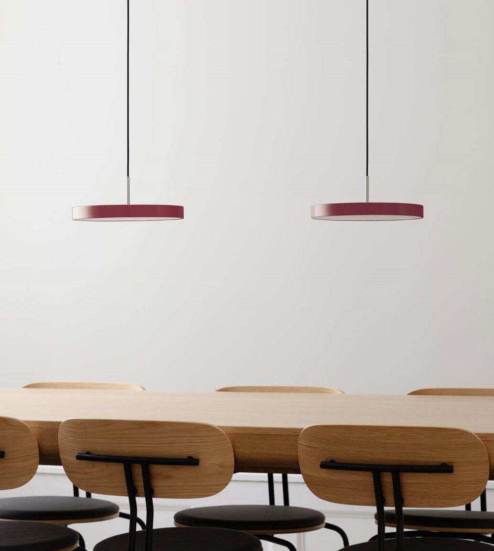 Asteria Plus mini in robijnrood is een variant van de populaire Asteria hanglamp, die is uitgerust met een ingebouwde dimmer en de mogelijkheid voor montage in een lichtrail. De extra mogelijkheden met Asteria Plus vergroten de flexibiliteit en maken samen met het elegante minimalistische ontwerp de lamp tot een voor de hand liggende keuze voor zowel kantoorverlichting, keukenruimtes of lamp boven de eettafel.