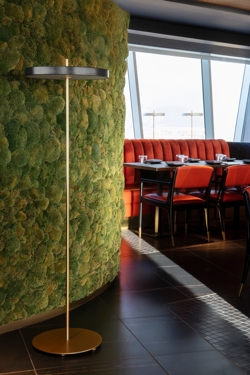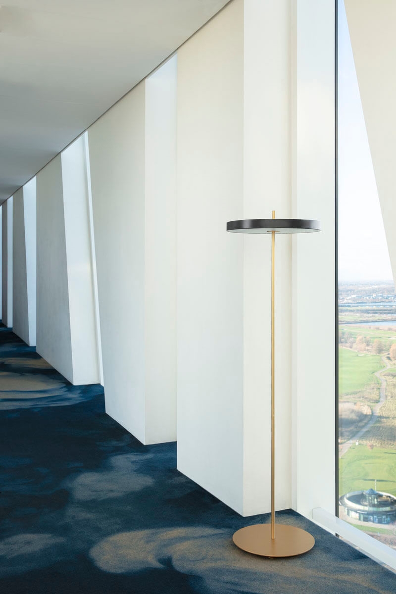 Asteria de vloerlamp is verkrijgbaar in verschillende kleuren met een basis en stang van messing. De Asteria-serie bestaat uit hanglampen, vloerlampen, wandlampen, plafondlampen en spots evenals tafellampen en oplaadbare draagbare tafellampen.