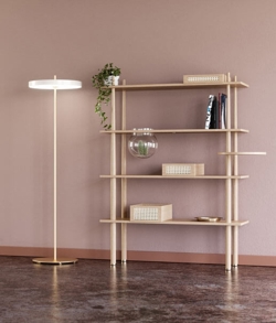 Asteria vloerlamp is verkrijgbaar in verschillende kleuren met een basis en stang van messing. De Asteria-serie bestaat uit hanglampen, vloerlampen, wandlampen, plafondlampen en spots evenals tafellampen en oplaadbare draagbare tafellampen.