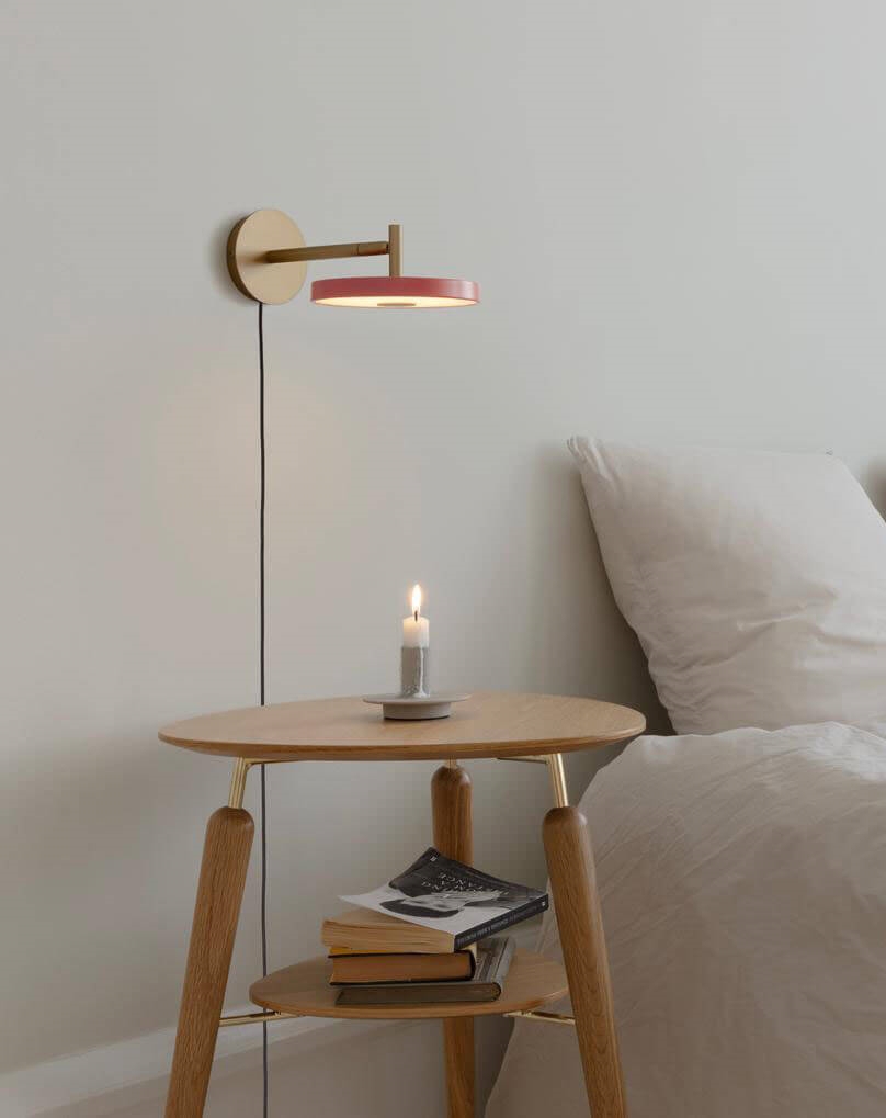 De korte Asteria wandlamp in roze heeft een minimalistisch ontwerp met een tijdloze uitstraling. De lamp heeft een geïntegreerde LED-lichtbron met een aangenaam licht dat kan worden gedimd via een discrete knop aan de onderkant van de kap.