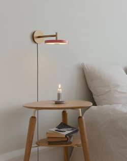 Asteria wandlamp is verkrijgbaar met een korte of met een lange extra flexibele lampenarm in messing met kap in verschillende kleuren. Deze variant is met snoer en stekker voor stopcontact. Er is ook een hardwired variant voor directe montage op lampuitgang.
