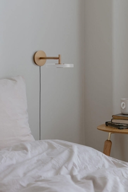 Asteria wandlamp is verkrijgbaar met een korte of een lange extra flexibele lamparm in messing met kap in verschillende kleuren. Deze variant is met snoer en stekker voor stopcontact. Er is ook een hardwired variant voor directe montage op een lampuitgang.