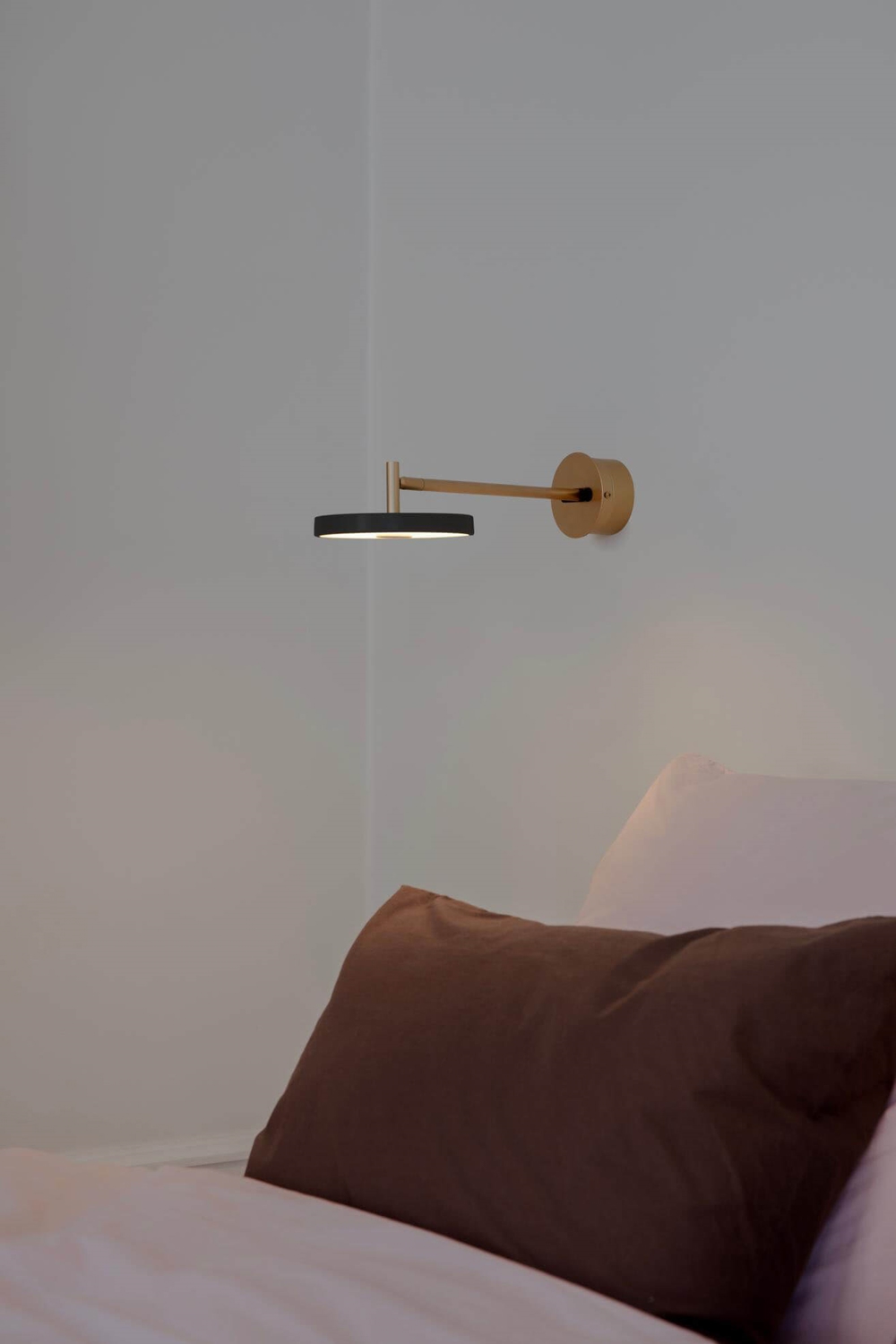 Asteria wandlamp is verkrijgbaar met een korte of met een lange extra flexibele lampenarm in messing met kap in verschillende kleuren. Deze variant is hardwired voor directe montage op een lampuitgang. Er is ook een variant met snoer en stekker voor stopcontact.