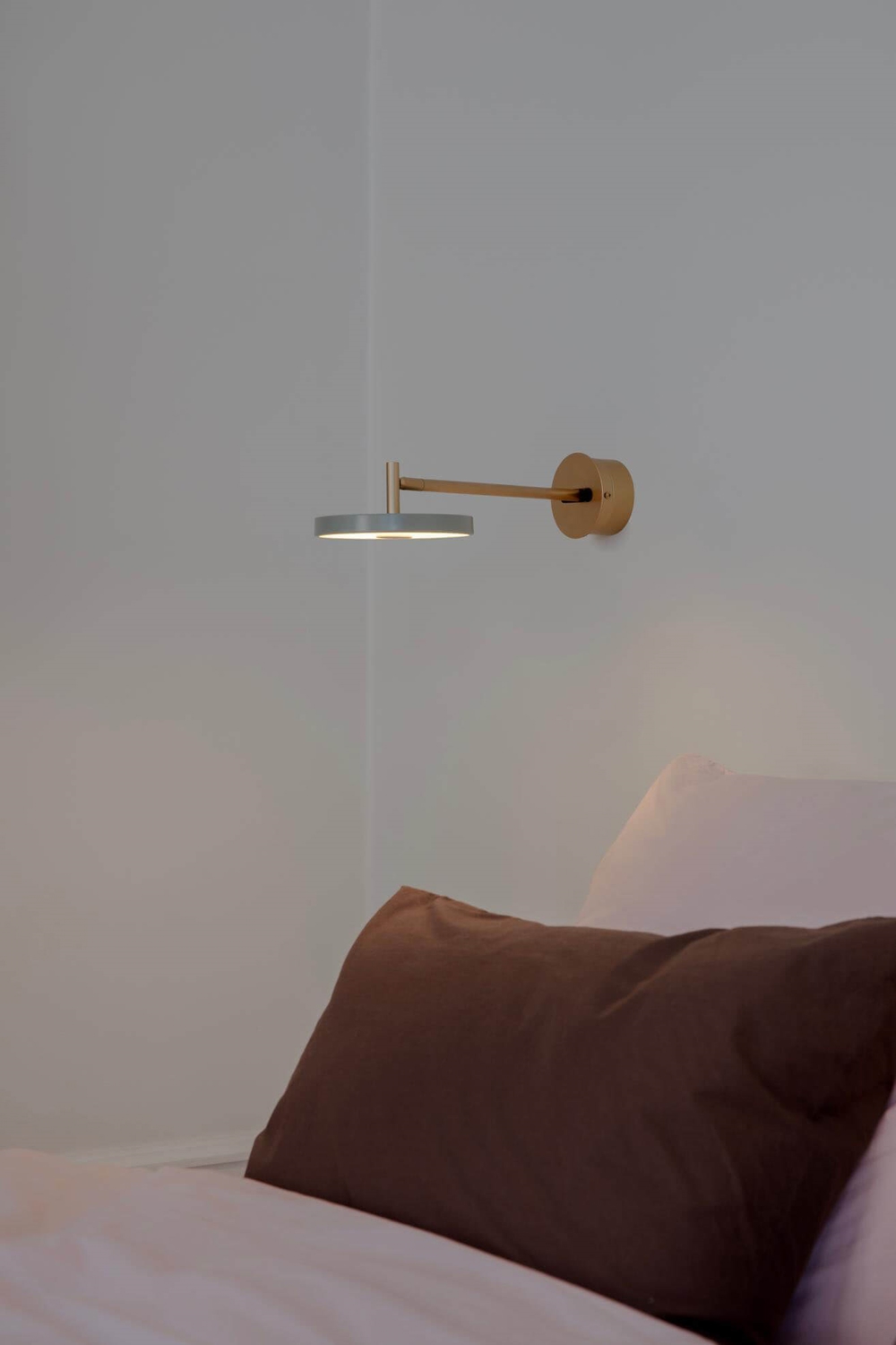 Asteria wandlamp is verkrijgbaar met een korte of met een lange extra flexibele lampenarm in messing met kap in verschillende kleuren. Deze variant is hardwired voor directe montage op een lampuitgang. Er is ook een variant met snoer en stekker voor een stopcontact.