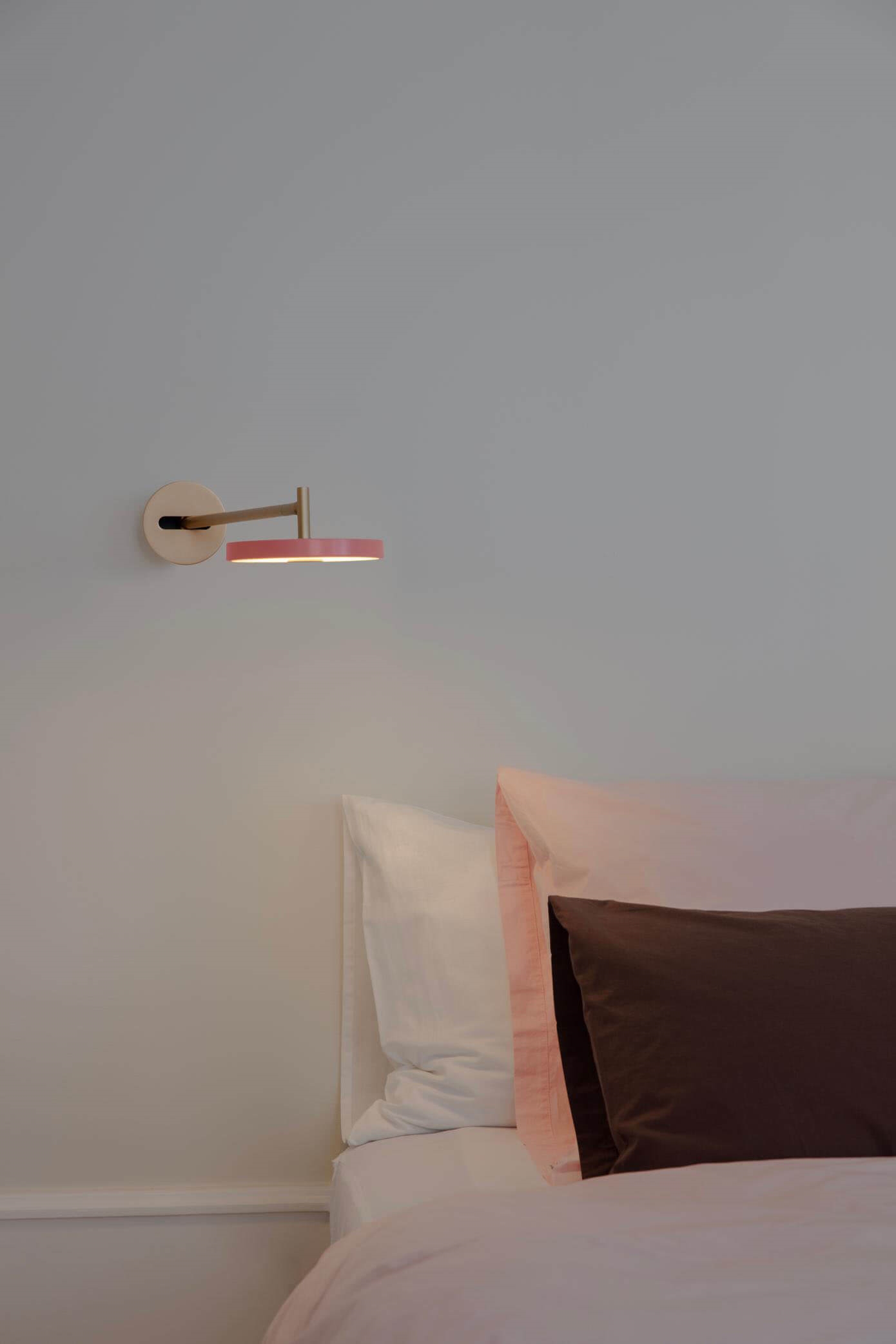 De lange Asteria wandlamp in roze heeft een minimalistisch ontwerp met een tijdloze uitstraling. De lamp heeft een geïntegreerde LED-lichtbron met een aangenaam licht, dat kan worden gedimd via een discrete knop aan de onderkant van de kap.