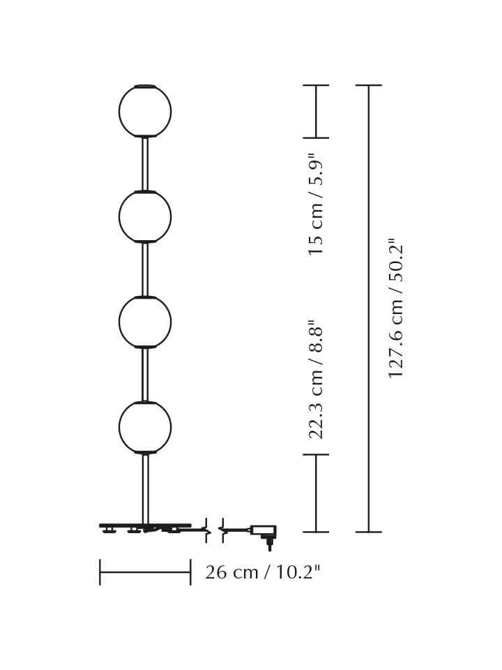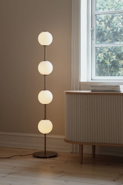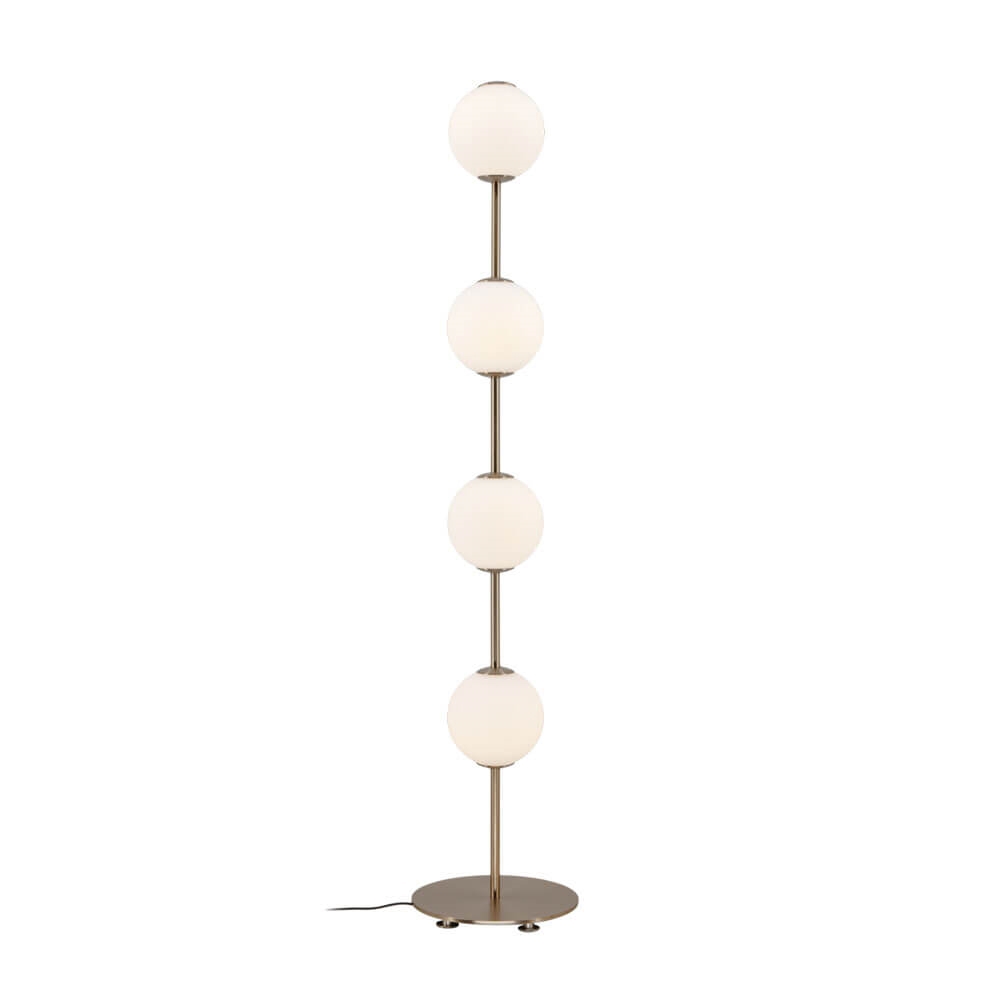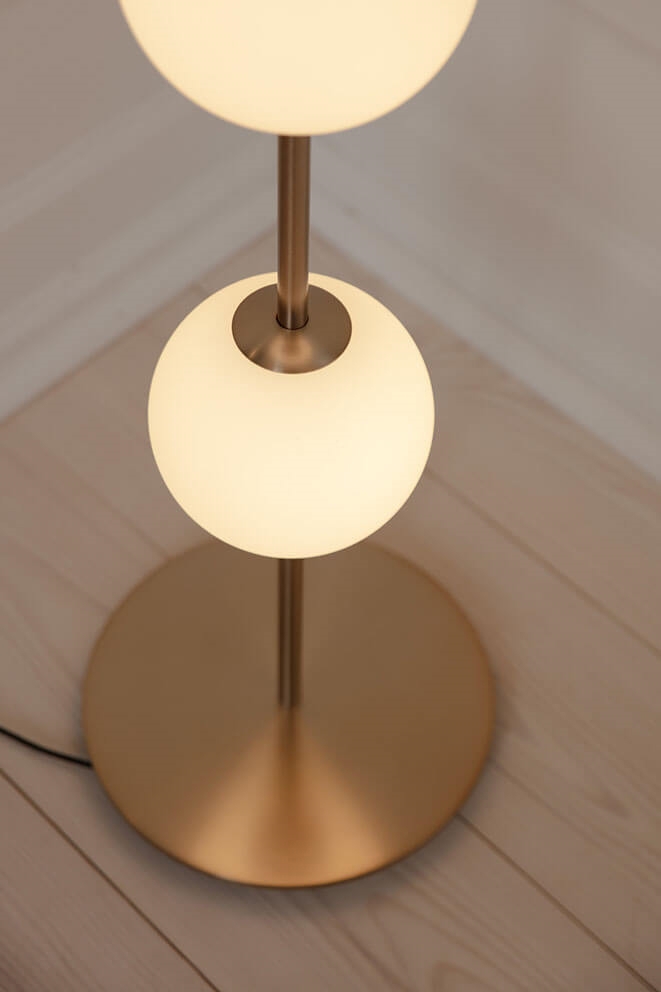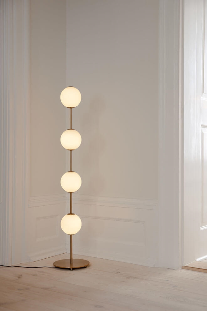 De vloerlamp Audrey heeft messingdetails en vier mondgeblazen bolvormige kappen van opaalglas, die doen denken aan een rij elegante verlichte parels. De lamp verspreidt een zacht en aangenaam licht en is een verfijnde toevoeging aan elk interieur. Gebruik Audrey bijvoorbeeld als verlichting in de woonkamer of uitnodigend licht in de hal.