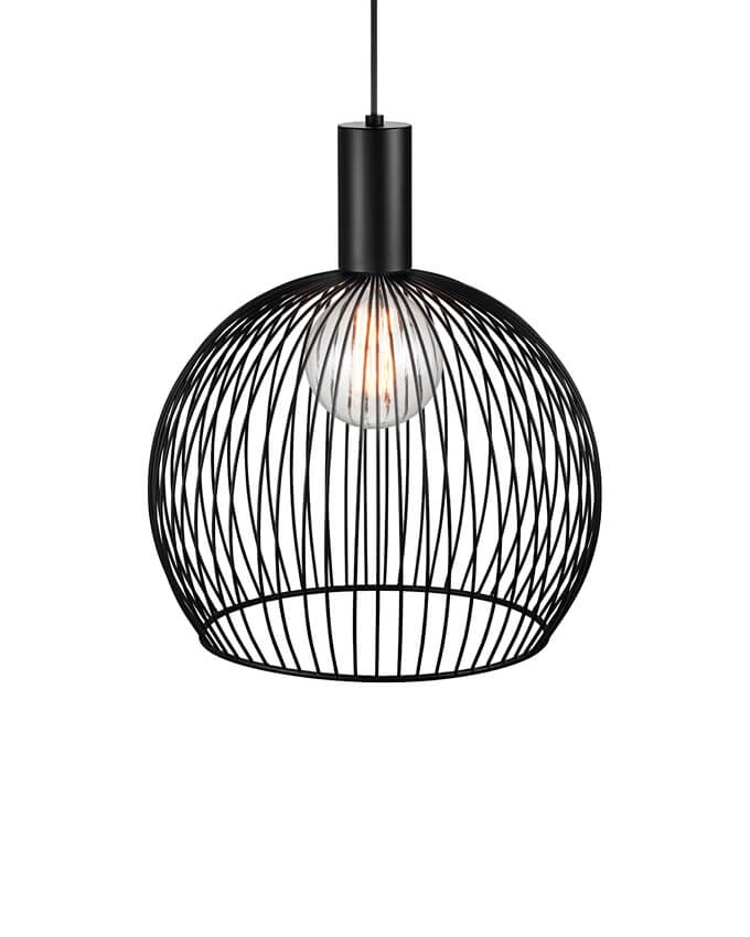 Het ontwerp van de hanglamp is eenvoudig en esthetisch. De zichtbare lamp is omgeven door gebogen metalen draden, die een prachtig licht en fascinerend schaduwspel geven.