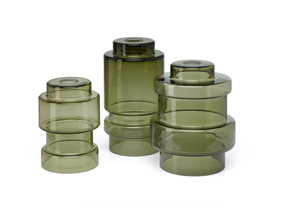 De glazen kappen zijn verkrijgbaar in drie maten en vier kleuren - smoke blue, new brown, antique green en opal white.