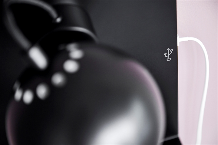 Deze versie van de Ball USB wandlamp heeft een gegraveerd USB-symbool.