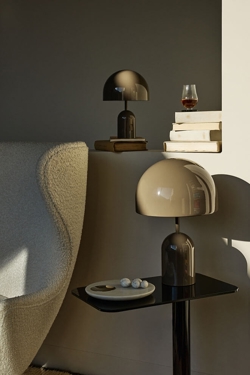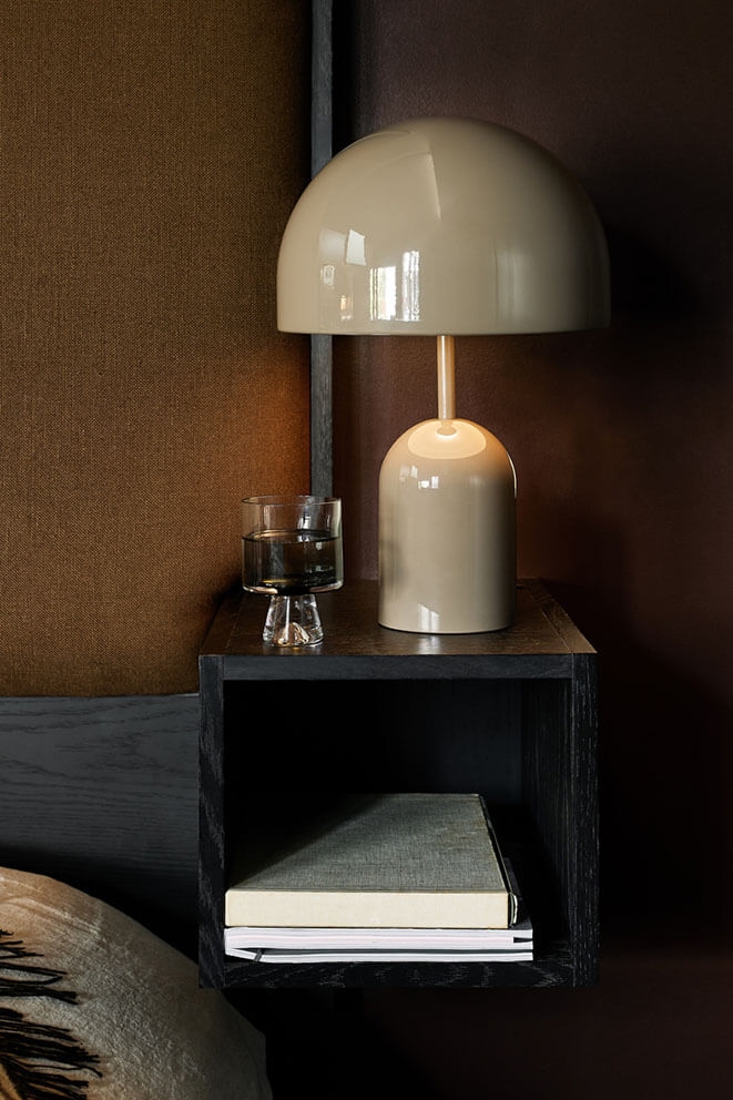 De tafellamp Bell ontleent zijn naam aan de klassieke klokvorm en heeft een reflecterend oppervlak dat de toon en kenmerken van de omgeving weerspiegelt. De lamp kan bijvoorbeeld worden geplaatst op een nachtkastje of salontafel, in een boekenkast of misschien op de vensterbank.