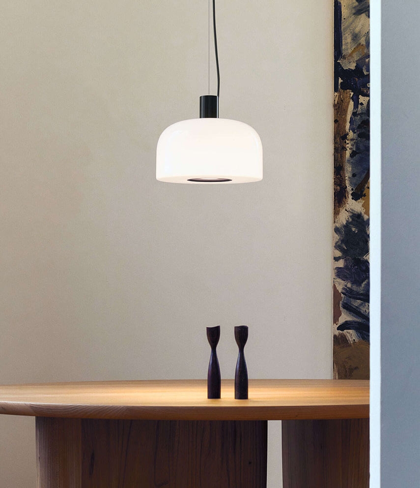 Bellhop Glas de hanglamp is verkrijgbaar in twee maten en naast een top in cioko ook met een top in wit of helder aluminium. Er is ook een plafondlamp en tafellamp in de lampenserie.