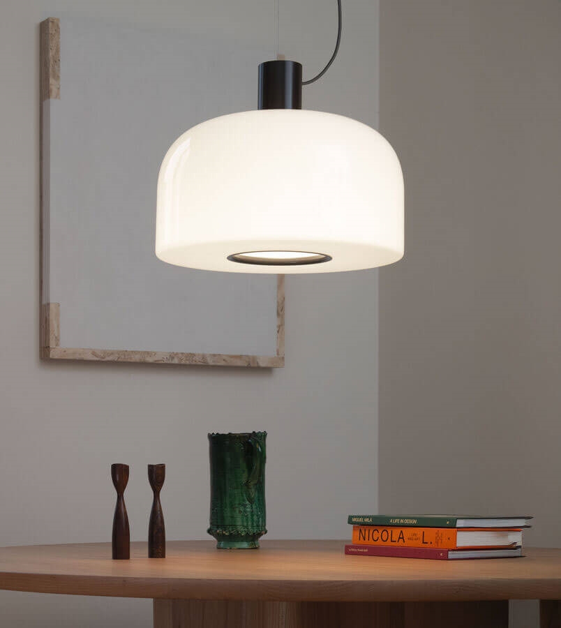 Bellhop Glas de hanglamp is verkrijgbaar in twee maten en naast de top in cioko ook met top in wit of helder aluminium. Er is ook een plafondlamp en tafellamp in de lampenserie.