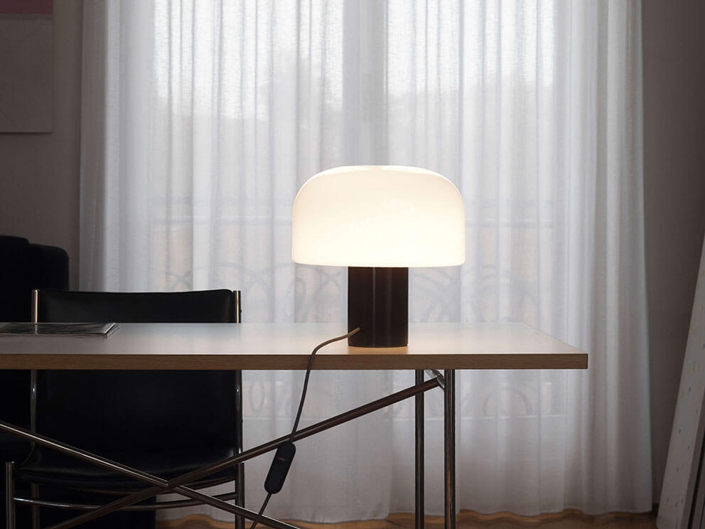 Bellhop Glas tafellamp is naast de basis in cioko ook verkrijgbaar met een basis in wit of helder aluminium. Er zijn ook hanglampen en plafondlampen in de lampenserie.