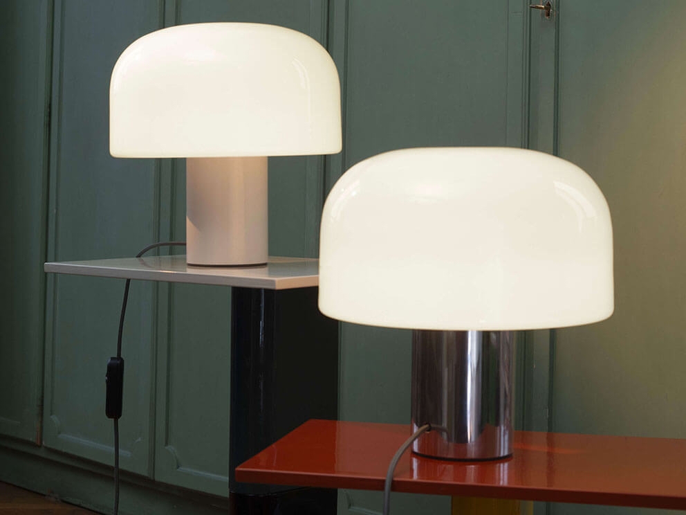 Bellhop Glas tafellamp is naast de basis in bright aluminium ook verkrijgbaar met een basis in wit of cioko. Er zijn ook een hanglamp en plafondlamp in de lampenserie.