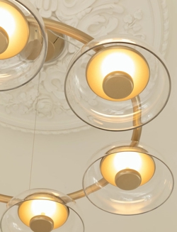 Blossi maakt gebruik van de nieuwste LED-technologie, zichtbaar in het speciaal ontwikkelde LED-module. Geplaatst in de lamp, zodat het licht weerkaatst in de glazen en metalen kap - en een prachtig en zacht, indirect licht verspreidt in de ruimte. Het speciaal ontwikkelde LED-bord is geplaatst in een gouden metalen schijf en stuurt het licht omhoog in de 6 lampenkappen. Het LED-bord zelf is vervangbaar en voldoet aan de nieuwste EU-eisen voor flikkervrij licht.