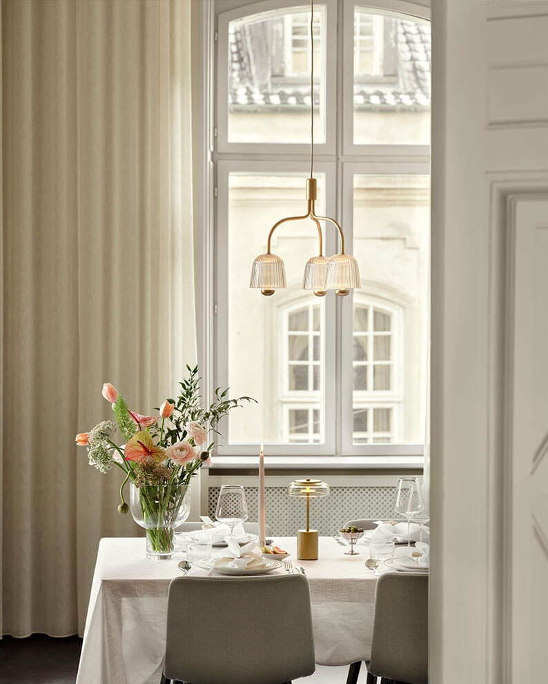 Blossi is verkrijgbaar als verschillende tafellampen en als hanglamp, wandlamp, vloerlamp en kroonluchter.