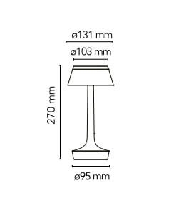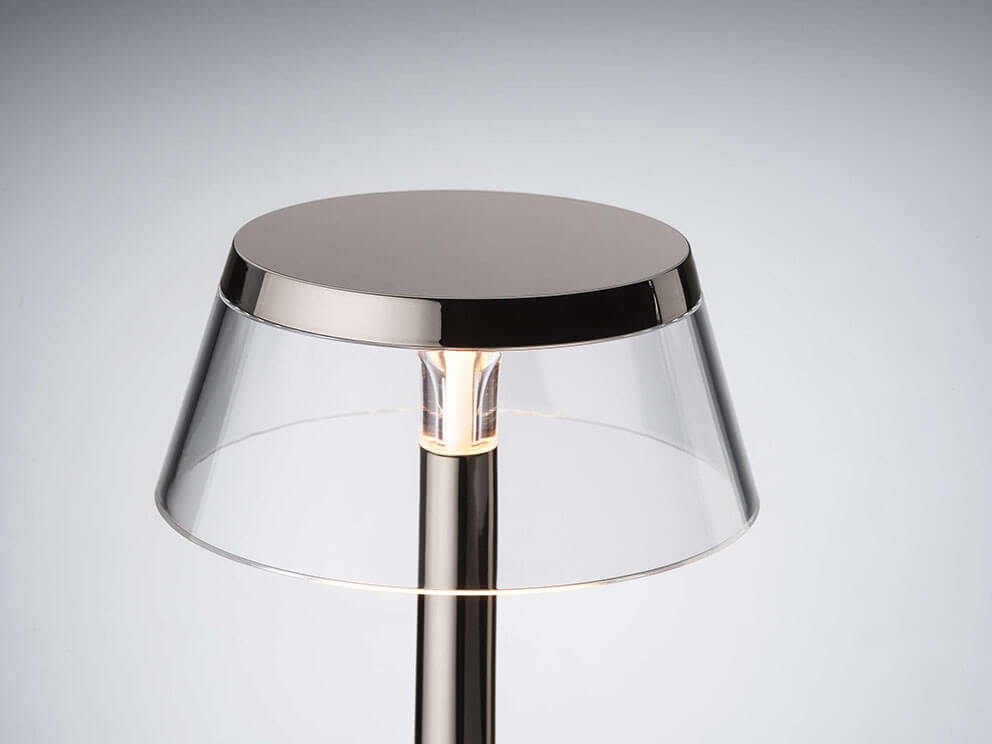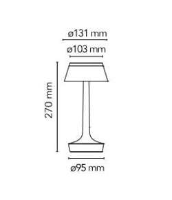 Slimme draadloze tafellamp van Flos in vervaagd blauw, die gemakkelijk mee te nemen is en bediend wordt via een optische sensor op de basis. De helderheid van de tafellamp is dimbaar in vier stappen en de kleurtemperatuur kan worden ingesteld op 2200K, 2700K of 3000K. Afhankelijk van de gekozen instellingen kan de batterijlamp tussen 6 en 24 uur branden voordat deze moet worden opgeladen met de meegeleverde USB-kabel of via draadloze Qi.
