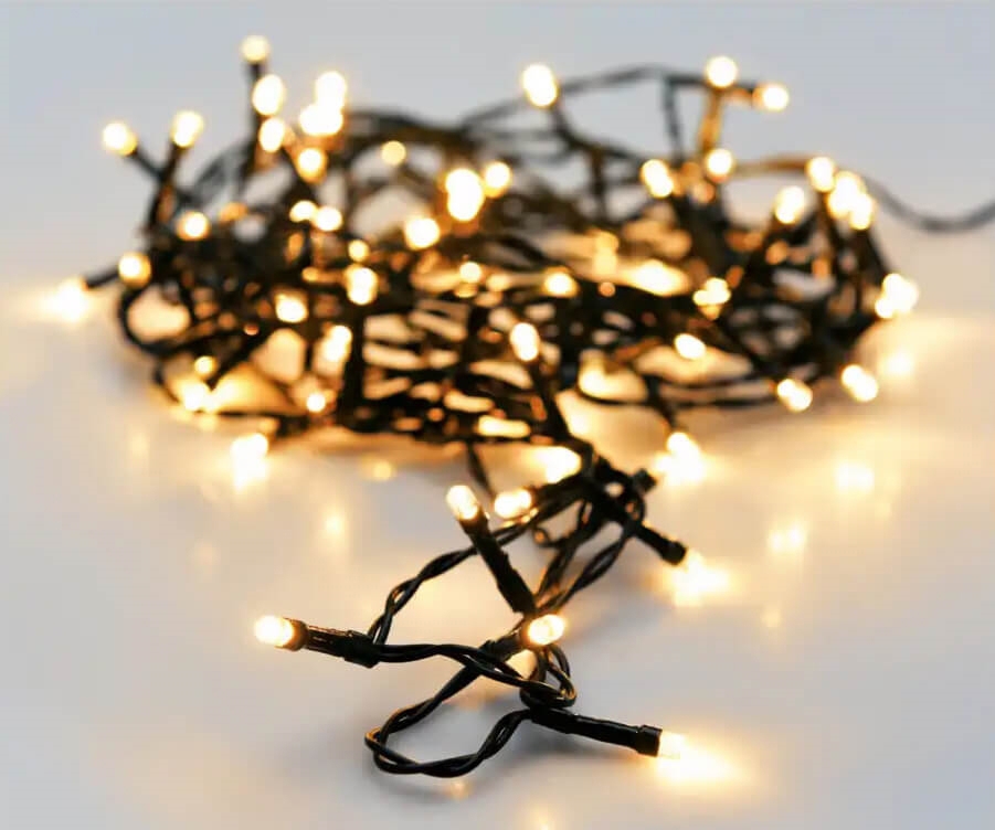 Creëer sfeer en ambiance buiten met deze gezellige lichtslinger met zwarte kabel. De slinger heeft 120 LED-lampjes met een afstand van 7,5 cm tussen elk lampje, die in een warm witte kleur schijnen. De totale lengte inclusief 3 meter kabel voor de LED-lampjes is 12 meter. Hang de lichtslinger in een boom of gebruik deze om sfeer te creëren op het terras of op het balkon.