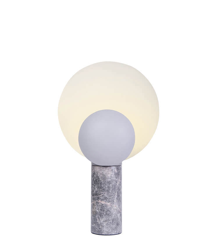 Caché tafellamp heeft een spannend en opvallend ontwerp. De lamp is gemaakt van twee ronde schermen die elegant worden verenigd door een stevige marmeren basis. Caché creëert een interessante en speelse sfeer, waarbij het licht heen en weer wordt gereflecteerd tussen de twee tinten.