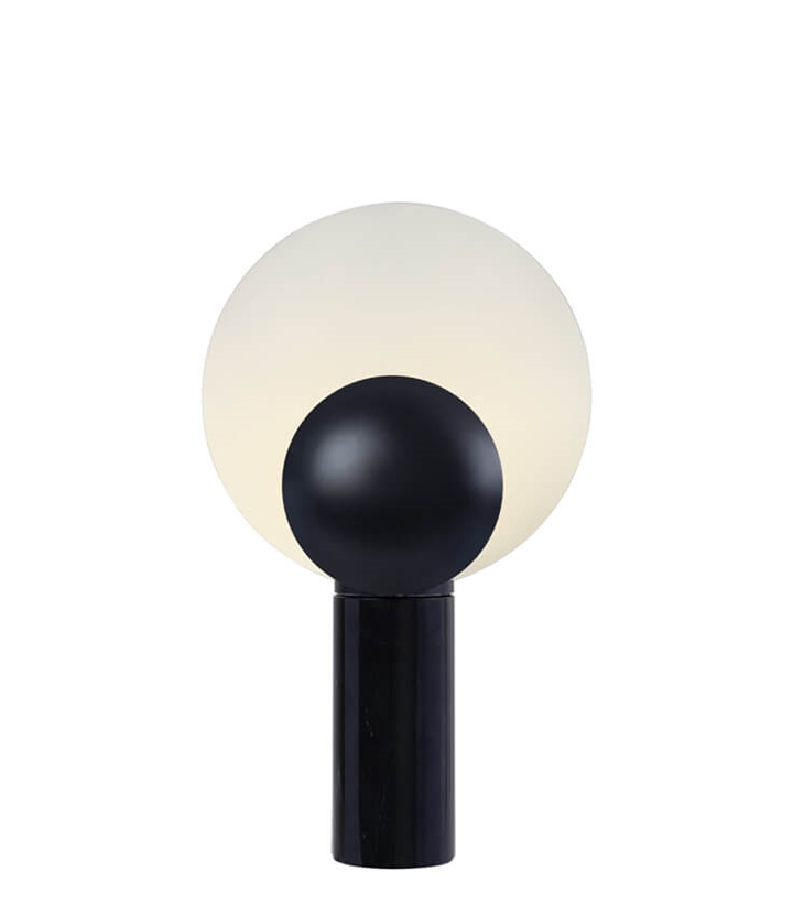 Caché tafellamp heeft een spannend en opvallend ontwerp. De lamp is gemaakt van twee ronde schermen die elegant worden verenigd door een stevige marmeren basis. Caché creëert een interessante en speelse sfeer, waarbij het licht heen en weer wordt gereflecteerd tussen de twee tinten.