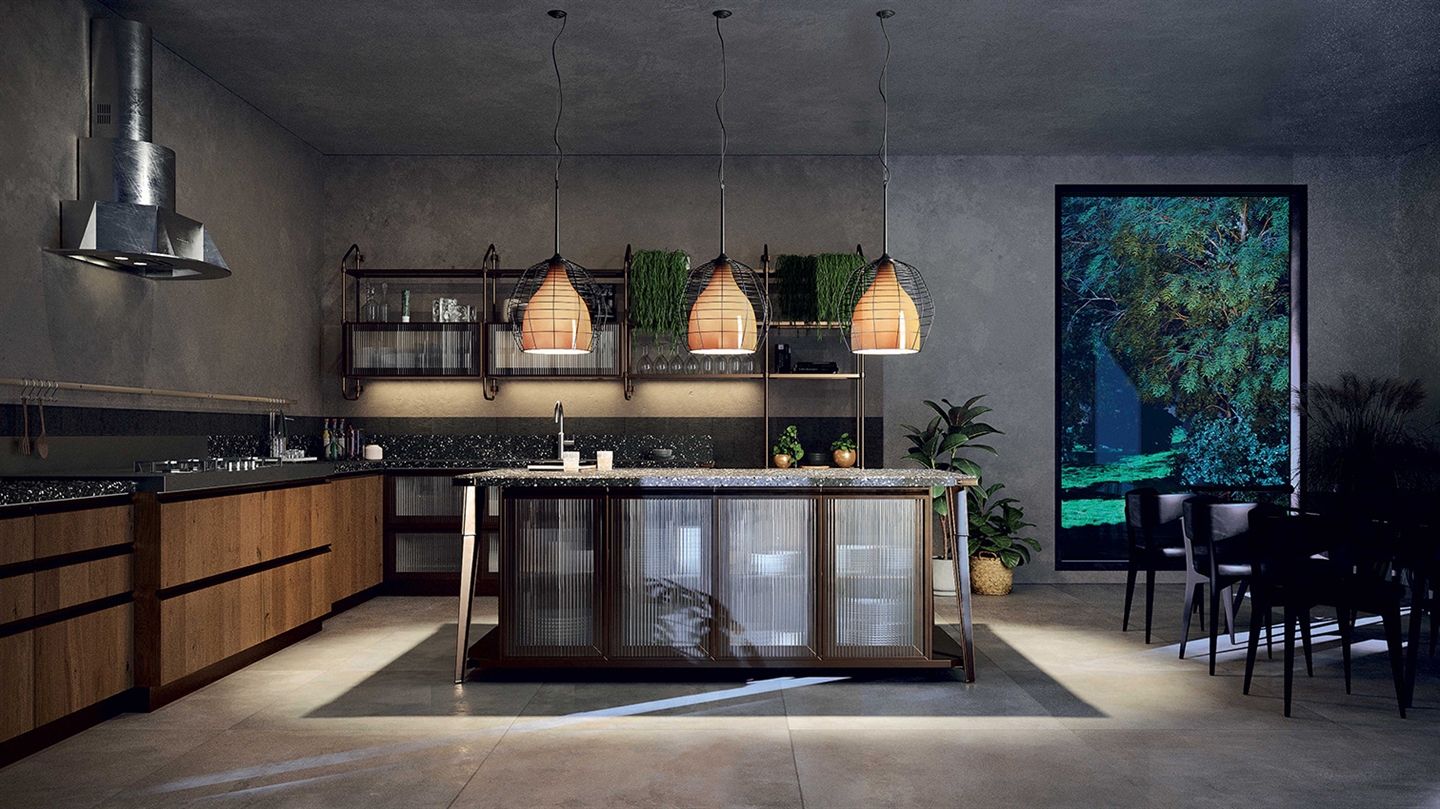 Het ontwerp van de lamp is vooral gericht op het contrast tussen het industrieel ogende metaal en het fijne geblazen glas.